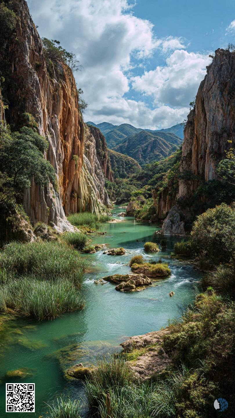 Rainbow Canyon Oasis | Towering cliffs glow in red and gold, while emerald water meanders through the gorge—an ethereal landscape sculpted by time.
