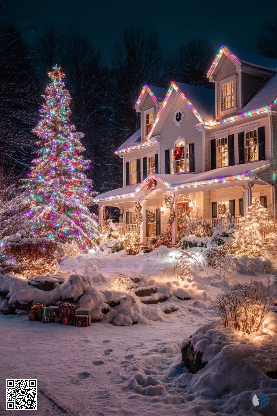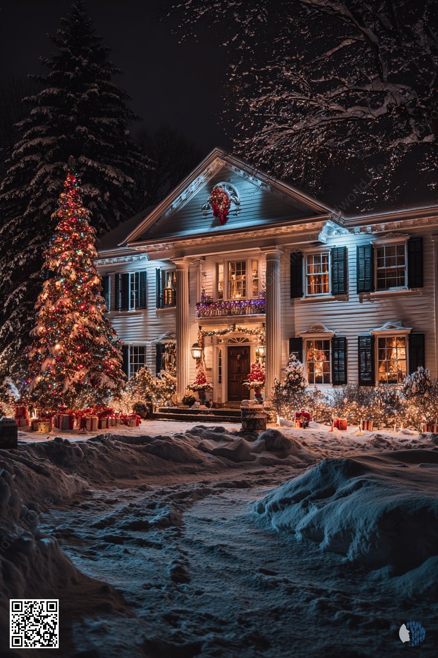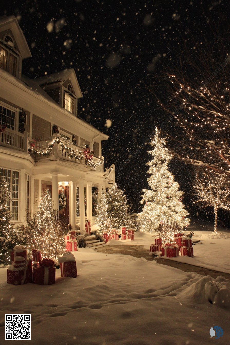 Տեսարանը ծավալվում է խաղաղ ձմեռային գիշեր, որտեղ օդը մաքուր է և լցված տոնական սեզոնի հմայիչ ոգով։ Հմայիչ տունը զարդարված է փայլուն լույսերով, որոնք մեղմորեն փայլում են մթնշաղ երկնքի ֆոնի վրա։ Պատուհաններից ճառագող տաք լույսը հարմարավետության զգացողություն է առաջացնում՝ ակնարկելով ներքին ջերմությունն ու ուրախությունը։ Դրսում ձյունը ծածկում է գետինը՝ ստեղծելով անարատ կտավ, որը արտացոլում է փայլող լույսերը՝ ամրապնդելով այս տոնական երեկոյի հանգիստ մթնոլորտը։