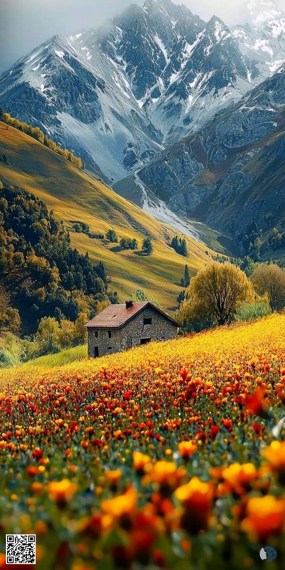 Ալպյան իդիլիա | Կանաչ մարգագետիններ ծաղիկներով, փայտե տներով և ձյունածածկ գագաթներով՝ լեռների հանգստությունը և ամռան վառ գույները։