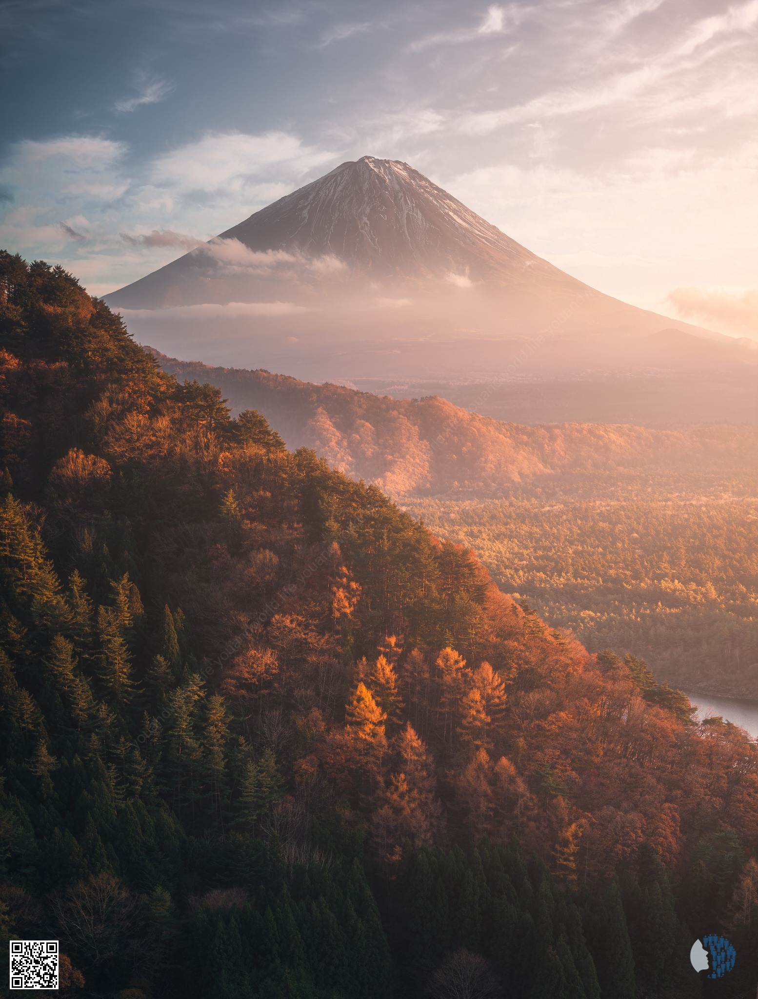 Ֆուձի լեռը աշնանը, Ճապոնիա | Արևածագի մեղմ երանգներ, լճերի վրայով լողացող մշուշ և Ֆուձիի շուրջը լողացող կրակոտ աշնանային անտառներ՝ հանգիստ, անժամանակ գեղեցկություն յուրաքանչյուր տեսարանում: