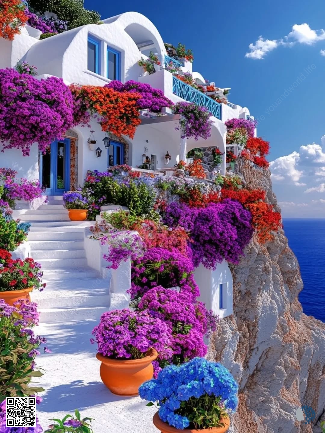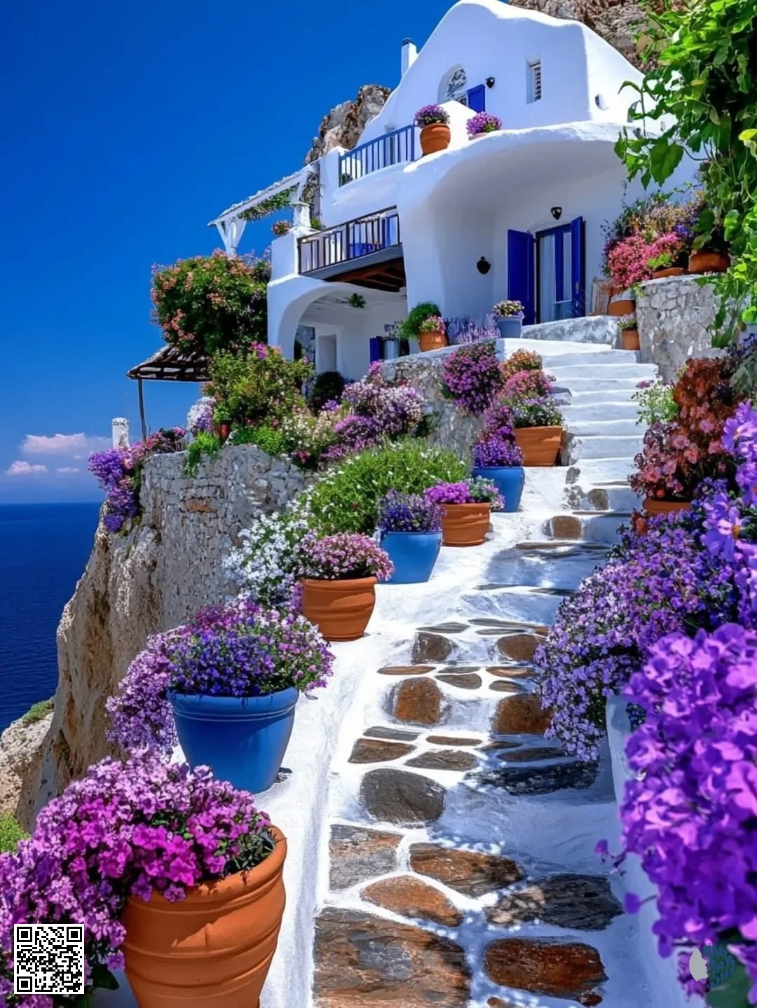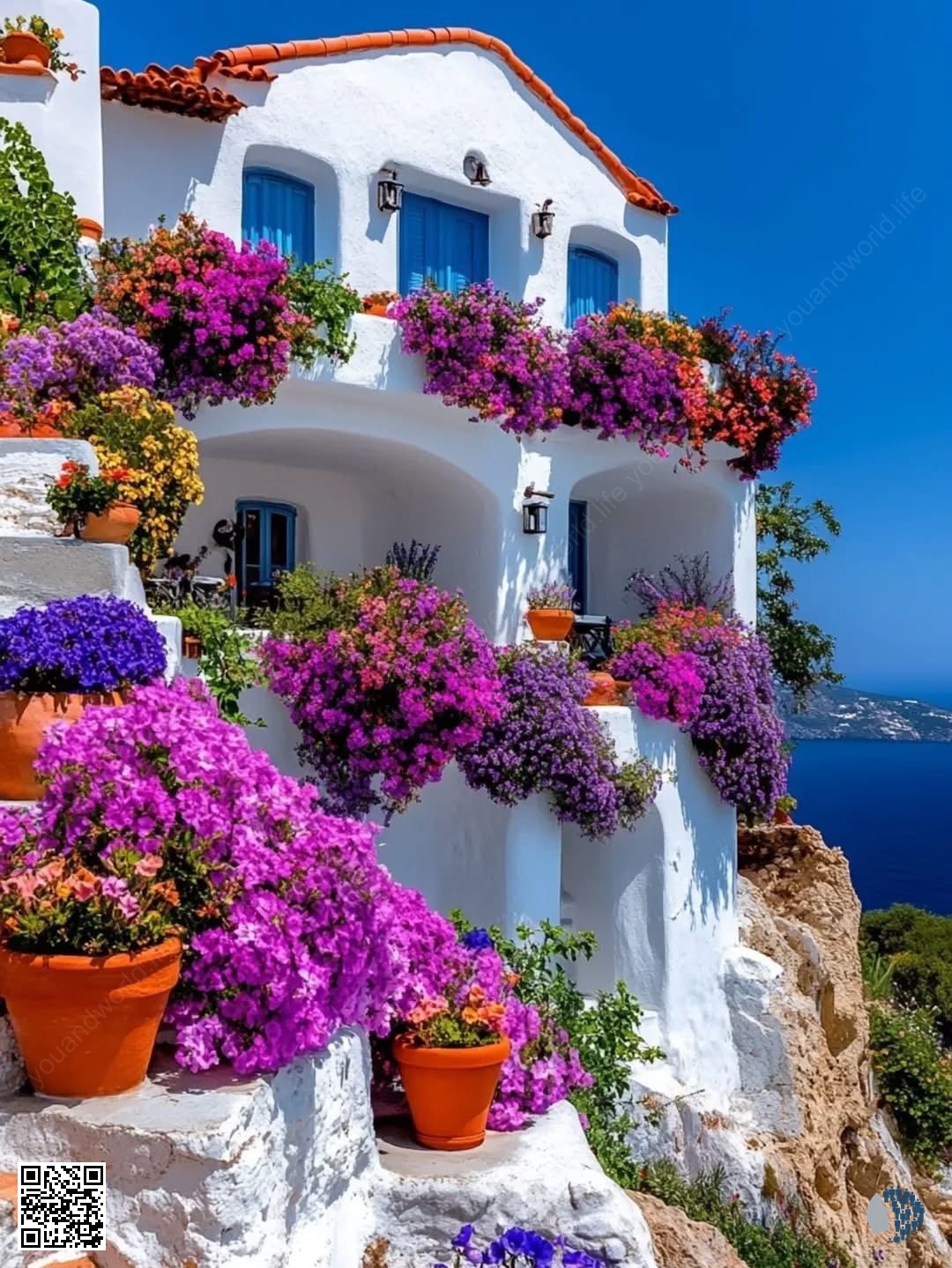 Կիկլադյան ծաղկող տուն | Սպիտակեցված կղզու պատերը, որոնք ծածկված են վառ բուգենվիլեայով, փայլում են խորը Էգեյան երկնքի տակ՝ ծովի տեսարաններով, որոնք զգացվում են որպես միջերկրածովյան երազանք