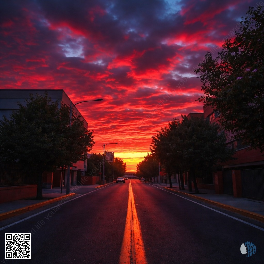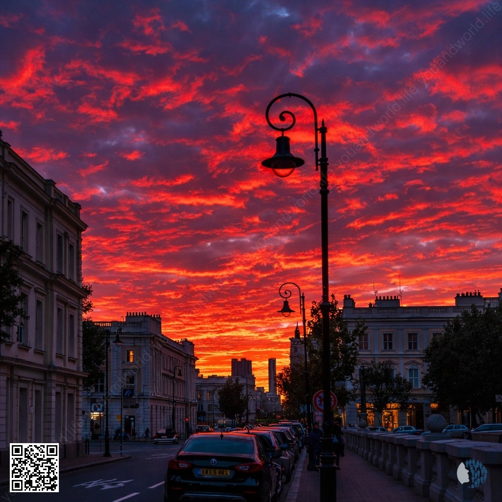 Լույսի և ստվերի փոխազդեցությունը ստեղծում է ցնցող հակադրություն, քաղաքային ճանապարհների հանգստությունը ծառայում է որպես վերևում գտնվող վառ տեսարանի ֆոն: Յուրաքանչյուր ամպ, կարծես, պարում է՝ պտտվելով կարմիրի և սաթի երանգներով, մինչդեռ փողոցների նուրբ կորերը ուղղորդում են աչքը դեպի հորիզոն: Այս տեսարանը գրավում է մի անցողիկ պահ՝ առաջացնելով քաղաքային լանդշաֆտի մեջ մտորումների և հանգստության զգացում: