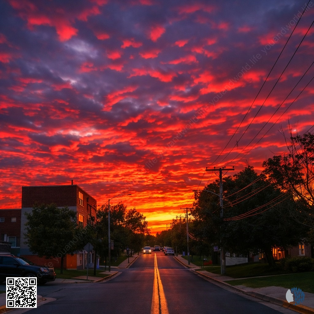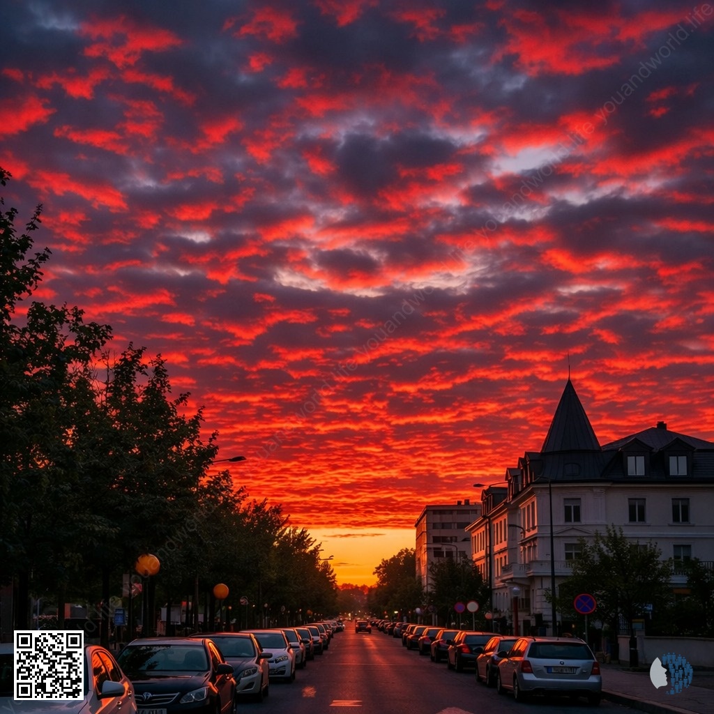 Երբ օրը վերածվում է գիշերվա, կարմիրի և ոսկեգույնի դրամատիկ ցուցադրությունը բոցավառում է գլխավերևում գտնվող ամպերը՝ սփռելով տաք լույս, որը սովորականը վերածում է անսովորի: Փողոցները, որոնք սովորաբար լի են կյանքով, ստանում են խաղաղություն, երբ արևը մայր է մտնում հորիզոնի տակ: Կայանված մեքենաները արտացոլում են վառ երանգները, դրանց մակերեսները դառնում են կրակոտ երկնքի կտավներ՝ հրավիրելով դիտողներին կանգ առնել և կլանել պահը: