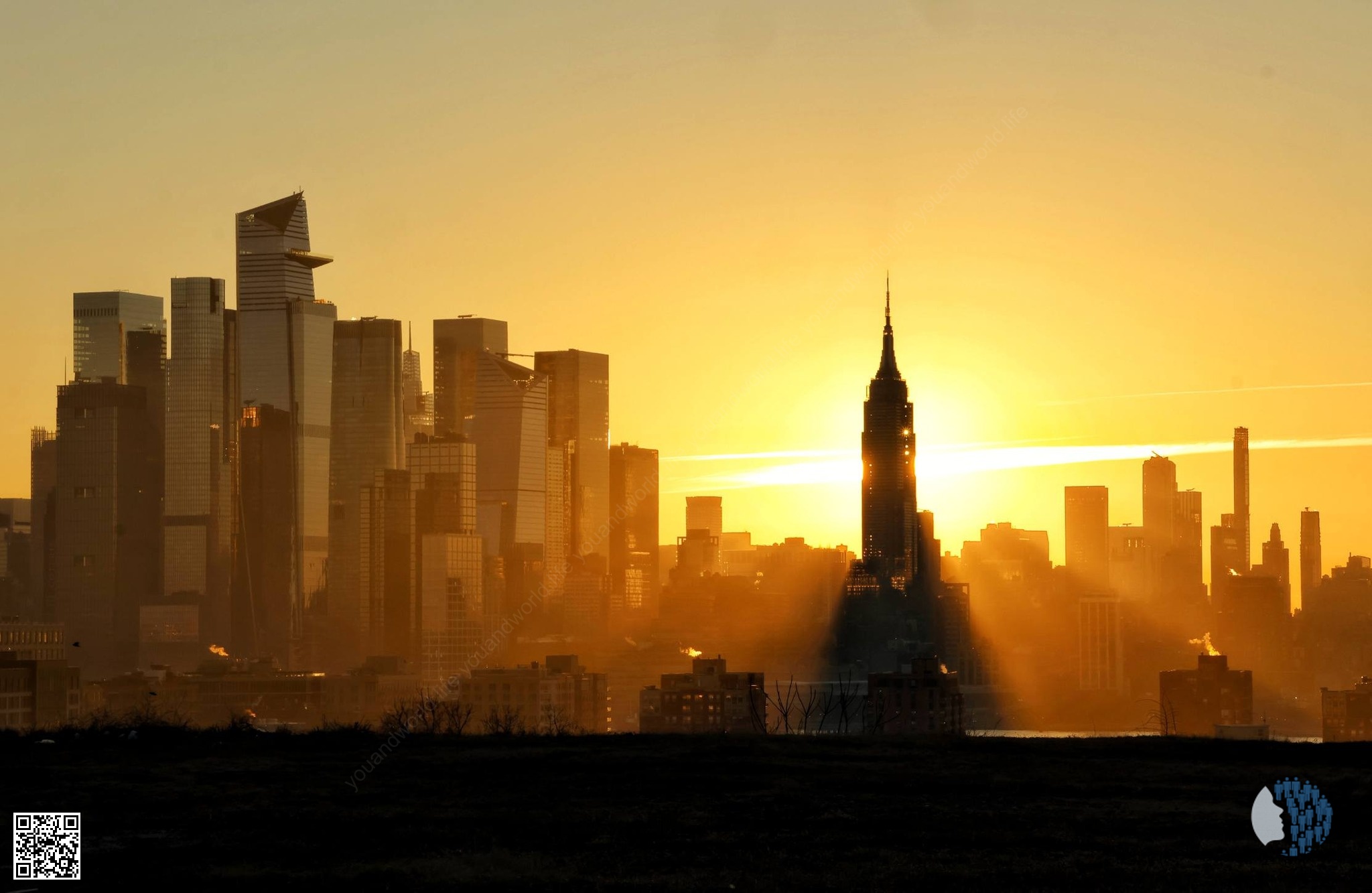 Empire State Sunrise | Golden sunrise behind the Empire State Building lights up the New York City skyline with dramatic rays and a warm morning glow