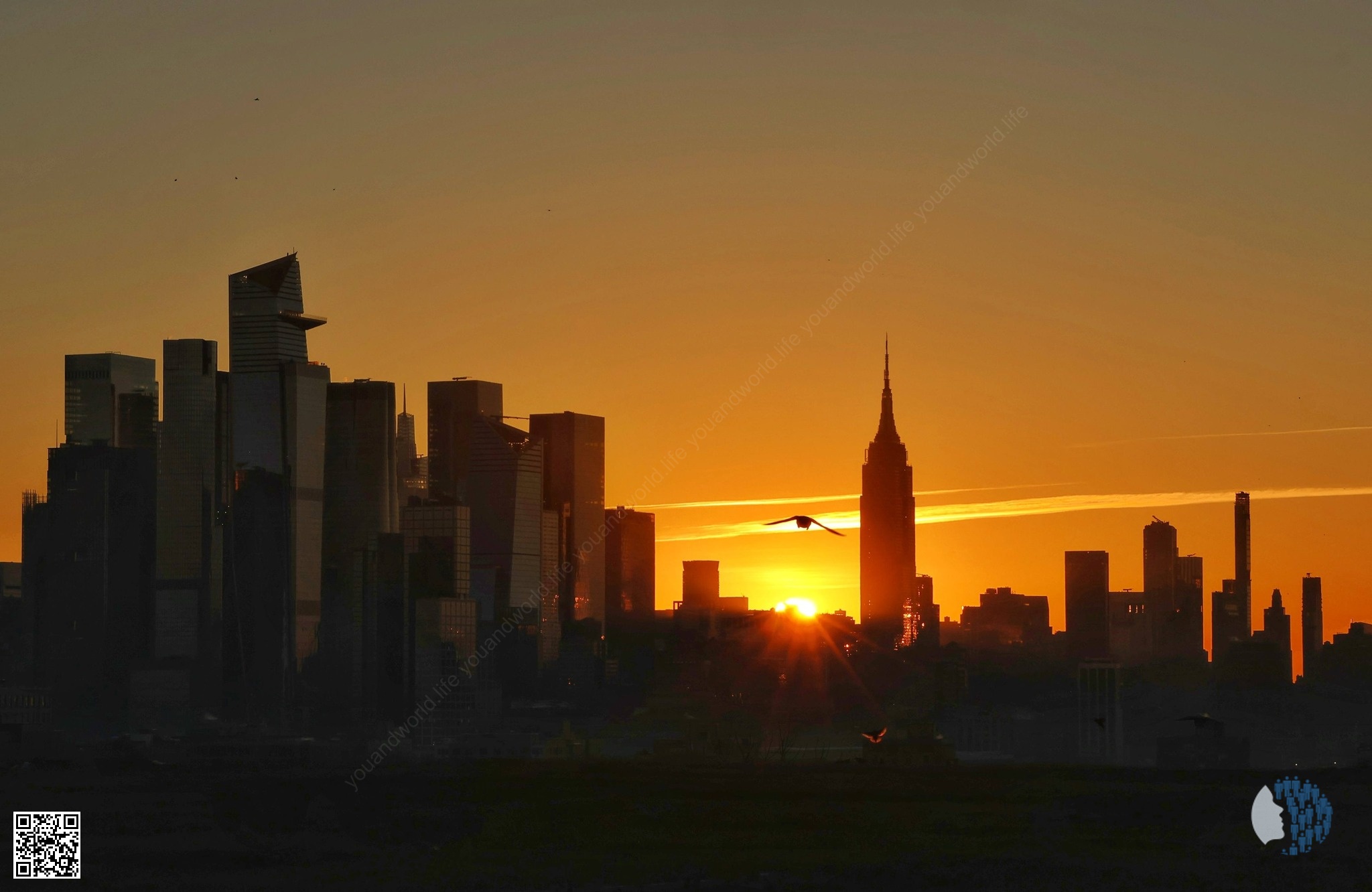 Golden sunrise behind the Empire State Building lights up the New York City skyline with dramatic rays and a warm morning glow
