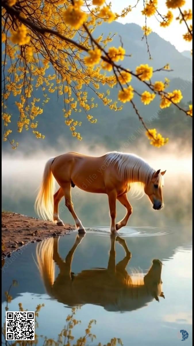 Օվկիանոսի ափին ձիերը վազում են ջրի միջով, նրանց սմբակները կոտրում են ալիքները՝ իրենց ետևում թողնելով փրփրուն հետքեր։ Այս նրբագեղ արարածները միաձուլվում են շրջակա բնության հետ՝ ստեղծելով ազատության և ուժի զգացողություն։ Արևմուտքը արտացոլող ջուրը կարծես դառնում է նկարի կտավ, որտեղ յուրաքանչյուր շարժում լի է դինամիզմով և կյանքով։
